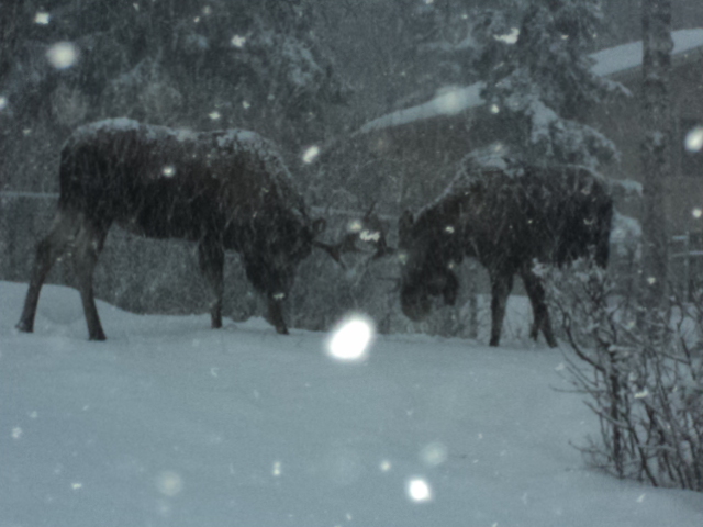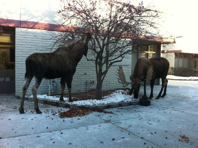 After dropping Devin off at her house, I stumbled across these two bull moose playing with each other in someone’s front yard. Look at ’em havin’ fun.