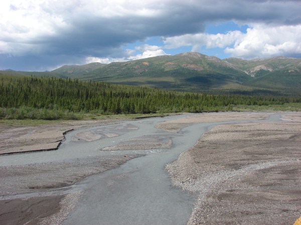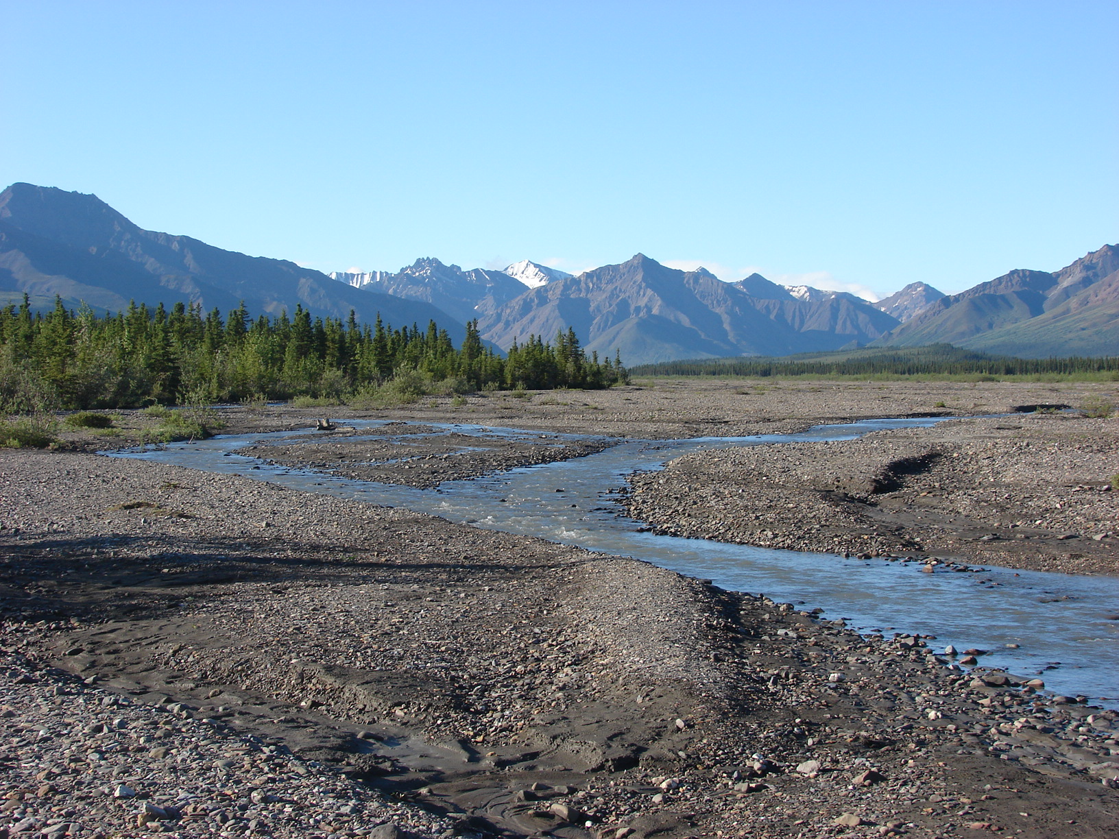 Like most rivers in Alaska, it looks like a huge bed of rocks and gravel with a few streams running haphazardly through it. This is called a “braided” river and here I’ll borrow some information gleaned from one of the Park’s several Earthcaches which explains that the relatively young mountains and glaciers in the Park send a heavy load of silt, rocks, and debris down these rivers. Some of that sediment settles and chokes off the river’s course, repeatedly forcing the water to cut a new path downstream. This is why the river bed is so wide. So wide in fact that it is impossible for the entire bed to fill up with water, unlike rivers in the lower 48 which are usually as wide as the river can get at flood stage. Denali is a bit of a sub-Arctic desert with only about 18 inches of rain a year and that, combined with the meltwater from the area glaciers, could never produce enough water to fill the riverbeds.