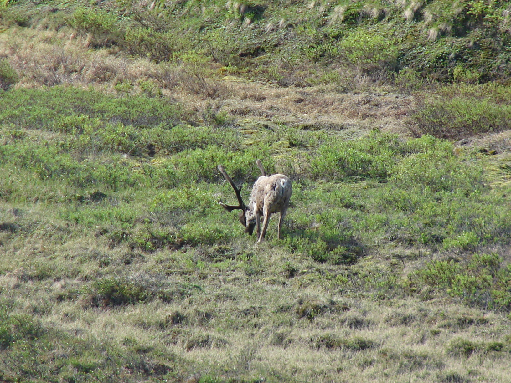 “Caribou, 3 o’clock!”    “Bear, 8 o’clock!”    “Sheep, 2 o’clock high!”  What fun!  Anyone who saw (or thought they saw) something would shout it out along with its general direction.  The bus driver would stop and everyone would clamber over to the appropriate side of the bus jockeying for position.   We had about a half-dozen or so grizzly bear sightings all of which were a bit too far away for a good photo, but were fun to watch through binoculars.  I think the best was a sow with her two Spring cubs which were running and playing and cutting up and not paying any attention to their mother who was obviously trying to get them to come on.  We also had multiple Caribou sightings.  Many of these guys were down in the riverbeds, but one guy (or gal.  It’s hard to tell which since both genders have massive antlers) was up on a hill lying in a patch of snow cooling off while this one below was totally focused on caloric intake.  Eating is serious business for animals in this part of the world since they only have about 3-4 months during the summer in which to consume the majority of their nutrition and calories for the entire year.