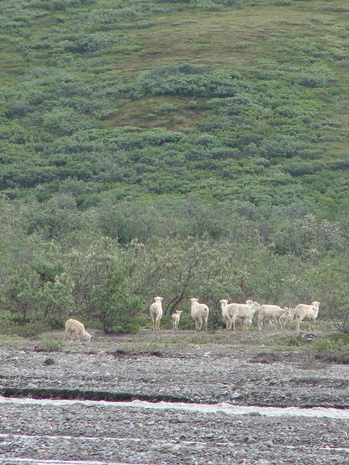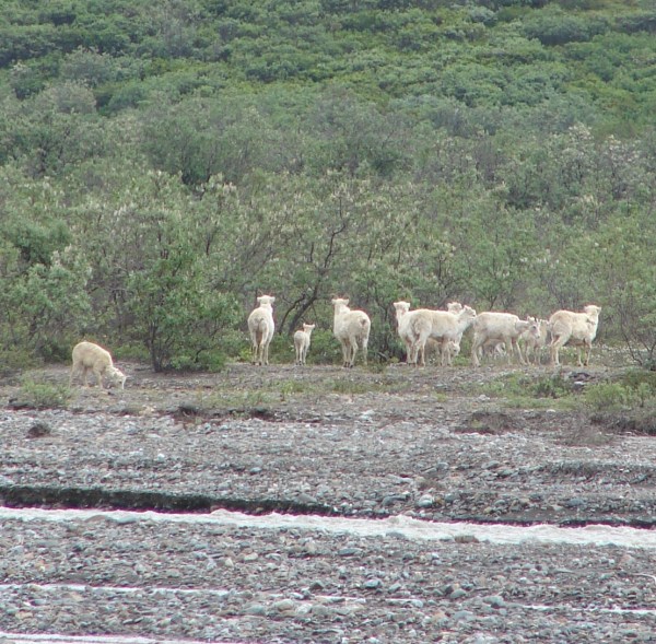 Dall Sheep, a cousin of Big Horn Sheep are prevalent in Alaska so it’s not surprising we saw several bands.  During the summer months, the males and females separate for reasons having to do with the kids, but I’m not sure exactly why.  In an earlier post, I showed a picture of a male band high up on a mountain which is where they are most protected from their primary predator, the wolf.  It was a bit unusual therefore to see a band of females and kids down on the riverbed since here they are most vulnerable to attack.  Our driver thought they might be crossing from one mountain to another.  Hope they all made it.