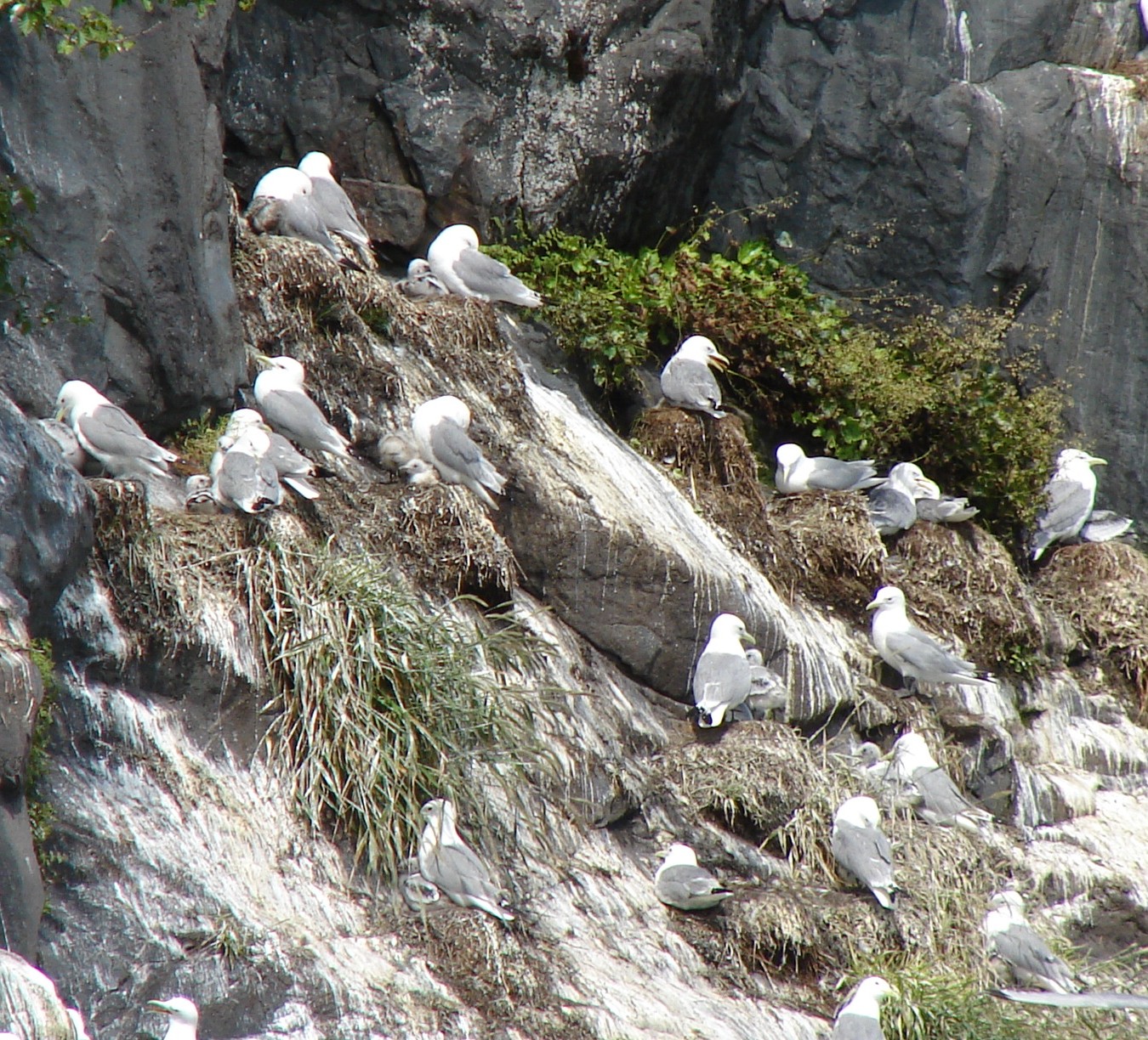 Kittiwakes are a type of small seagull and one of their many nesting sites, called a Rookery, is located to the right of the Blackstone Glacier.  You can tell a Kittiwake by their black wingtips.  See photos below.