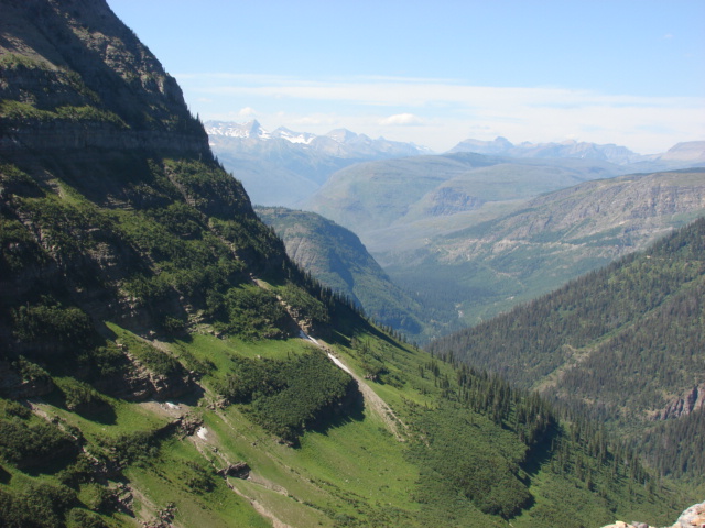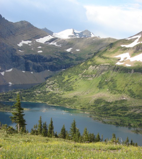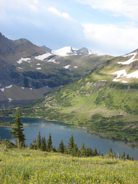 This is Hidden Lake and is taken from the trail before it drops down to the lake.  Hidden Lake is accessed from the high pass called Logan Pass.