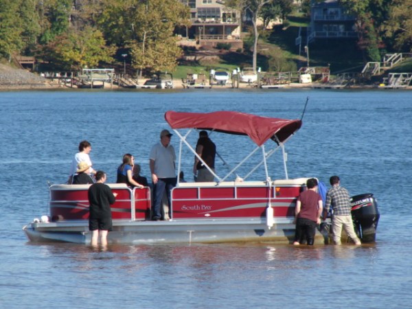 I’ve been camped on the shores of Lake Wylie for over three weeks now at a State Park called Ebenezer Park.  Just lovely.  For only $15 a night, I get a large, wooded site with full hook ups including wi-fi.  For those of you not in the know, this is a bargain and a half!  The campground is actually in South Carolina, just over the border from NC and is about an hour drive from the office in Charlotte (which I only have to go to once a week).   Like many lakes in this neck of the woods, Lake Wylie is long and skinny with lots of arms shooting off from the main body.  The average depth is only 21ft and this summer, I bet it’s a fair bit shallower than that due to the lack of rain.  There is a spot just off shore from where I often sit to read or study and I crack up at the number of boats who constantly run aground there as evidenced below.
