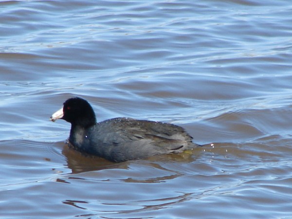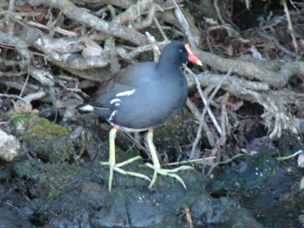 Here is a Common Moorhen who looks to me anything but common with his day-glo yellow legs and safety orange beak, but what do I know.