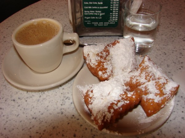 The first stop on yesterday’s agenda was Cafe Dumonde for Bengiettes (sp?) and cafe au lait. We used to go there after church sometimes. Yummy. It being a Saturday, the line was almost all the way down to the other side of Jackson Square, but going inside to find the restroom, I found several empty tables and a sign that said Self Seating, so I sat down and enjoyed a lovely breakfast.