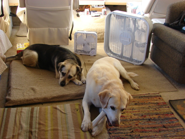 After two long days of driving (375 miles is long when driving Dora), I’ll be glad to stay here for two nights before moving on to Big Bend. It was interesting seeing the scenery change from green to brown to grayish brown and prickly all the while watching the temps rise from the 60’s to the 70’s to the 80’s, hence the title of this post. Much like Richard Dreyfus’ remark in Jaws when he finally saw the shark, “we’re gonna need a bigger boat”, Misty and Mosely were quick to point out upon our arrival in Texas, “we’re gonna need a bigger fan”. Here they are in front of the bigger fan with the pitifully small old one nearby for perspective.