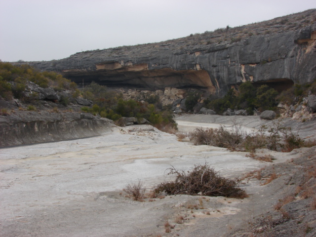 Seminole Canyon is dry except during flash floods. The long tan opening in the wall is the Fate Bell Shelter. The darker opening to its right is referred to as the Annex.