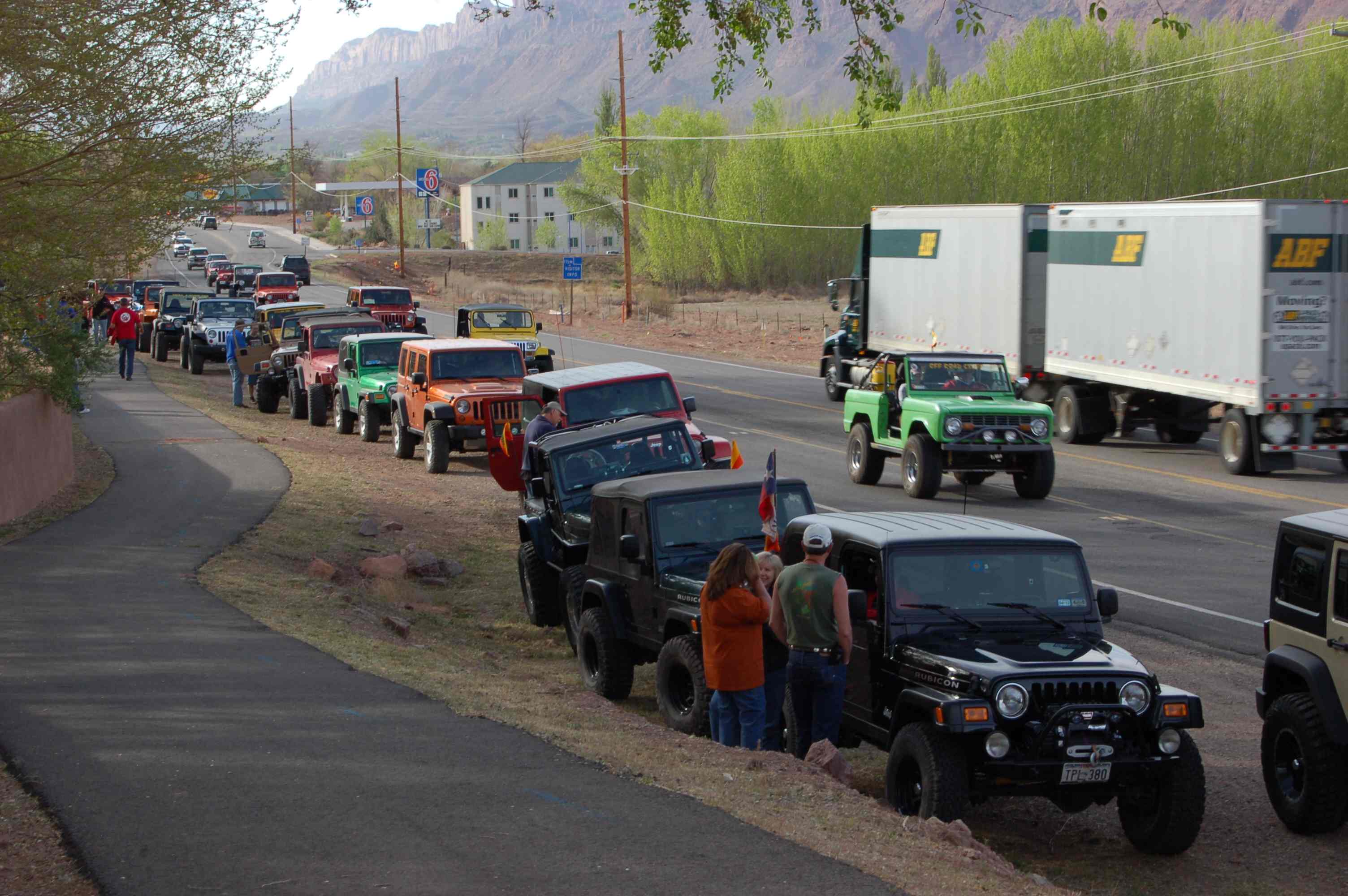 We worked this trip around Elo’s Spring Break dates, which happened to coincide with the 45th Annual Jeep Week in Moab. Oh my. Mountain Bikes vs Jeeps. It’s like sailboats vs motorboats, skis vs snow machines, and hikers vs ATV’s . There are those who prefer the power of an engine and there are those who prefer a less mechanized method of motion. We are the later, and were a bit nervous about all the motorized vehicles and their owners, but our fears were groundless, thank goodness, as we were really never inconvenienced or bothered by their presence or their noise which you may find hard to imagine when viewing the following photo (provided by Jim) of a group of them all lined up for their “safari”.