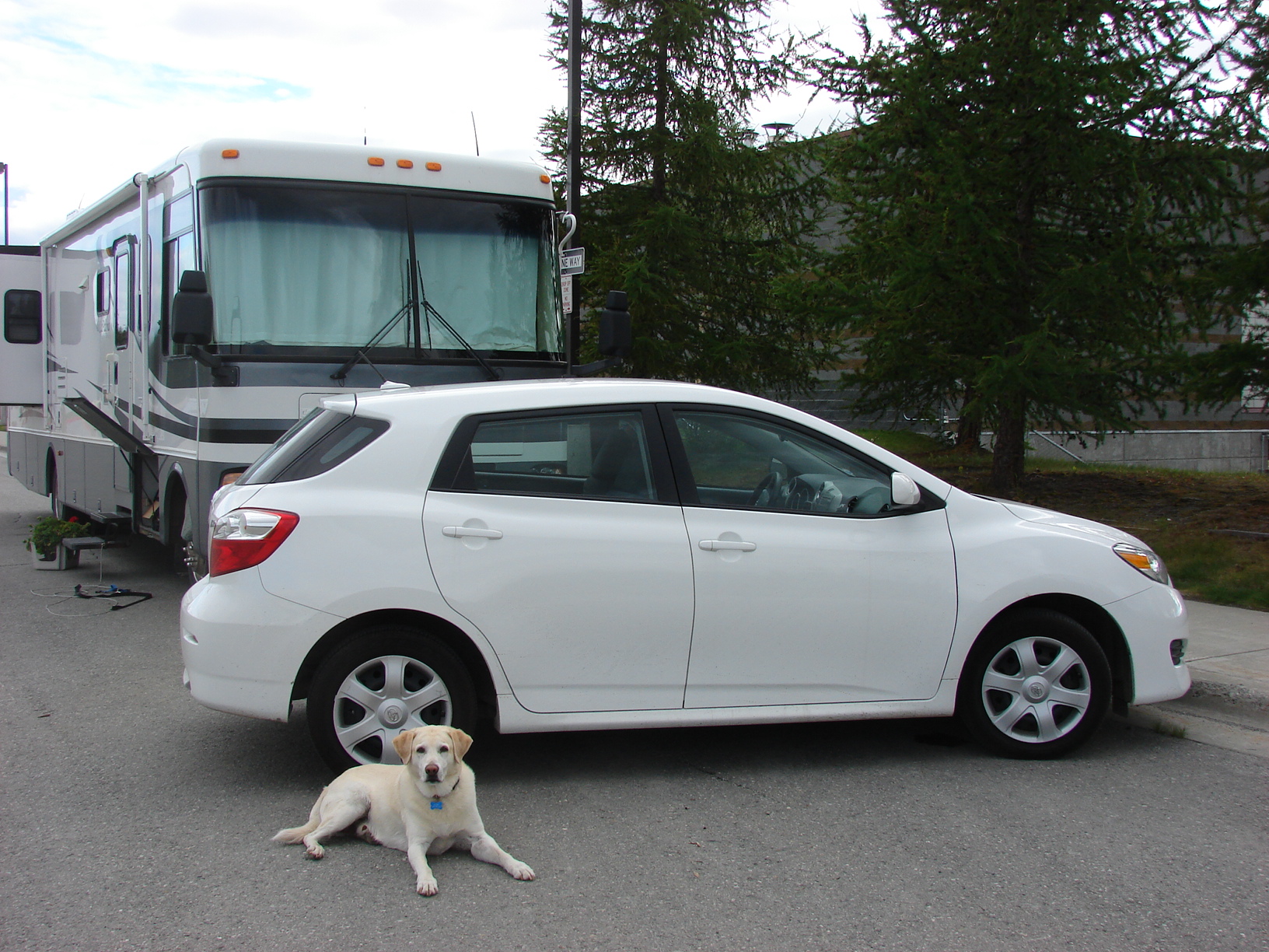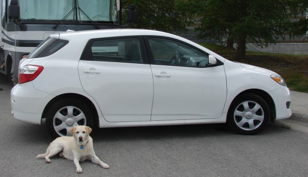 This is Lil’ Pea.  She is a 2009 Toyota Matrix weighing just over 2,800 lbs with a manual transmission and will serve as my tow car. That’s my yellow dog, Mosely, in front.